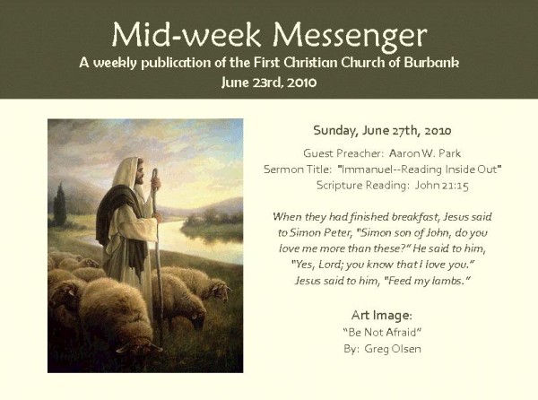 Mid-Week Messenger (June 23, 2010) 페이지 정보 작성자 새길 쪽지보내기 메일보내기 홈페이지 자기소개 아이디로 검색 전체게시물 쪽지보내기 메일보내기 홈페이지 자기소개 아이디로 검색 전체게시물 조회 9,674회 작성일 10-06-23 22:19 댓글 0 본문 이전글 Mid-Week Messenger (June 30, 2010) 다음글Mid-Week Messenger (June 16, 2010) 글쓰기 옵션 더보기 검색 목록 댓글목록 등록된 댓글이 없습니다.